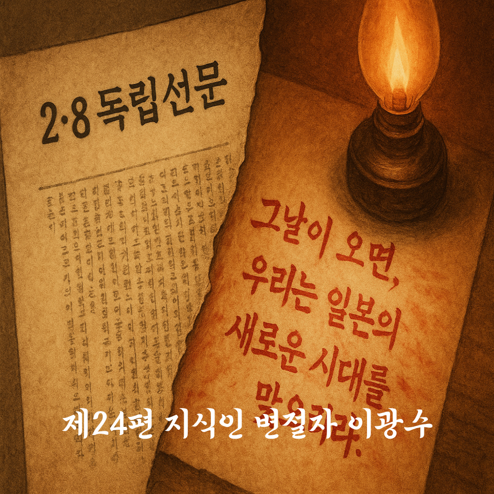 이광수는 1892년 평안북도 정주에서 태어나 기독교계 학교 오산학교를 거쳐 일본 도쿄 메이지학원에 유학했다. 유학생 시절, 그는 조선의 독립과 자주를 외치는 청년지식인 운동의 중심이었다. 1919 2·8 독립선언 때 도쿄 유학생 대표로 참여해 선언문 작성에 관여하고, 일본 경찰에 체포되었다. 이 선언은 곧바로 국내의 3·1운동으로 이어지는 불씨가 되었다. 그는 이후 귀국해 매일신보 기자로 활동하며 문학과 언론을 통해 민족의 자각을 일깨웠다. 1917년 발표한 〈무정〉 은 한국 최초의 근대 장편소설로, “사람이 사람답게 살기 위한 자각을 강조한 계몽문학의 상징이었다. 하지만 투옥과 고난, 현실적 한계 속에서 그의 사상은 점점 변했다. 그는민족이 살아남기 위해서는 일본 제국 안에서 길을 찾아야 한다는 ‘현실 민족주의론으로 기울기 시작했다. 1930년대 이후, 이광수는 조선문인협회 회장으로서 일제의 내선일체(內鮮一體) 정책과 황국신민화 운동을 문학으로 뒷받침했다. 그의 소설 〈임전의 소녀〉, 〈그날이 오면〉 등은 “조선 청년이 일본을 위해 싸우는 것이 명예라는 메시지를 담았고, 1942년에는 일본군 위문단에 참여해 “젊은이들이 제국의 깃발 아래 생명을 바치는 것은 민족의 영광이라 발언했다.